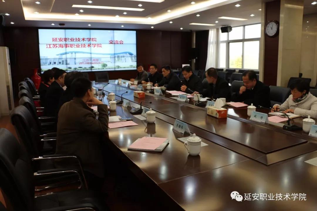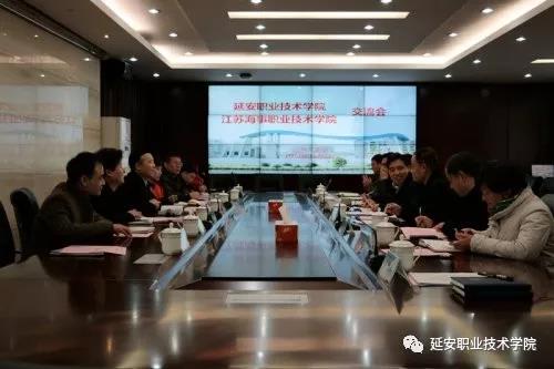随后,两校院系负责人分别介绍了院系基本情况和帮扶需求,并进行了交流探讨,双方达成初步合作意向,一是两院精准对接帮扶需求,优化合作方案,细化帮扶措施,确定时间表和路线图,建立有效的可持续的交流合作机制。二是完善教师支教制度,积极争取将教师支教工作纳入两省教育行政部门层面,调动教师支教的积极性和主动性;开展教师业务培训,推介退休专业教师来延任教,开放共享优质教学资源库,促进延安职院师资队伍建设。三是江苏海事职院出台院级层面上的政策措施,在教育教学改革、专业和课程建设、实践教学和技能竞赛等方面进行全方位合作,支援延安职院内涵式发展。四是将国家扶贫政策与区域产业政策相结合,借助江苏海事职院资源和专业优势,共同开发黄河河道三维动态模拟系统,助力黄河航运业发展和内河船员培训,促进陕西区域黄河文化旅游,使教育帮扶协作发挥更大作用。五是延安职院将发挥红色教育培训方面的资源优势,为江苏省海事职院师生来延接受红色教育、开展暑期实践活动或夏令营活动搭建平台,提供支持。六是明确将对口帮扶工作纳入两院2018年工作计划和财务预算,确定联络沟通部门,由延安职院制定详细实施方案,形成帮扶合作协议,2018年初拟在延安签订实施。