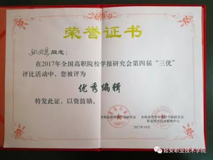 10月29—11月1日,全国高职院校学报研究会第四届第二次工作会议暨2017年学术年会在唐山召开。会议评选表彰了第四届全国高职院校优秀期刊、优秀主编、优秀编辑。《延安职业技术学院学报》凭借正确的办刊宗旨、鲜明的办刊特色在众多高职院校学报中脱颖而出,被评为“优秀学报”;我院学报编辑部责任编辑姚延宏老师被评为“优秀编辑”。
