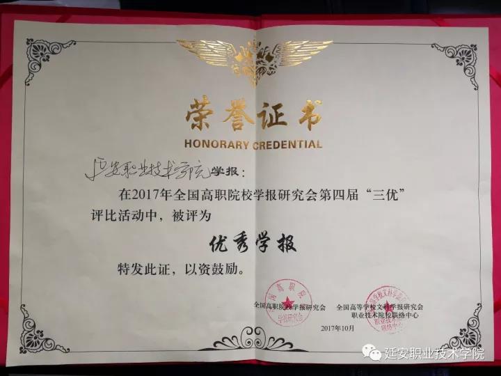 这是继2016年我院学报被陕西省高等学校学报研究会评为“陕西高校学报优秀期刊”之后,获得同行专家、学者肯定的又一有力明证。此次评优活动是由全国高职院校学报研究会、全国高等学校文科学报研究会职业技术院校联络中心共同组织的,主要从期刊的政治和管理质量、学术质量、数字化信息化、特色化与服务性、标准化规范化等评估指标进行客观、公正的评价。